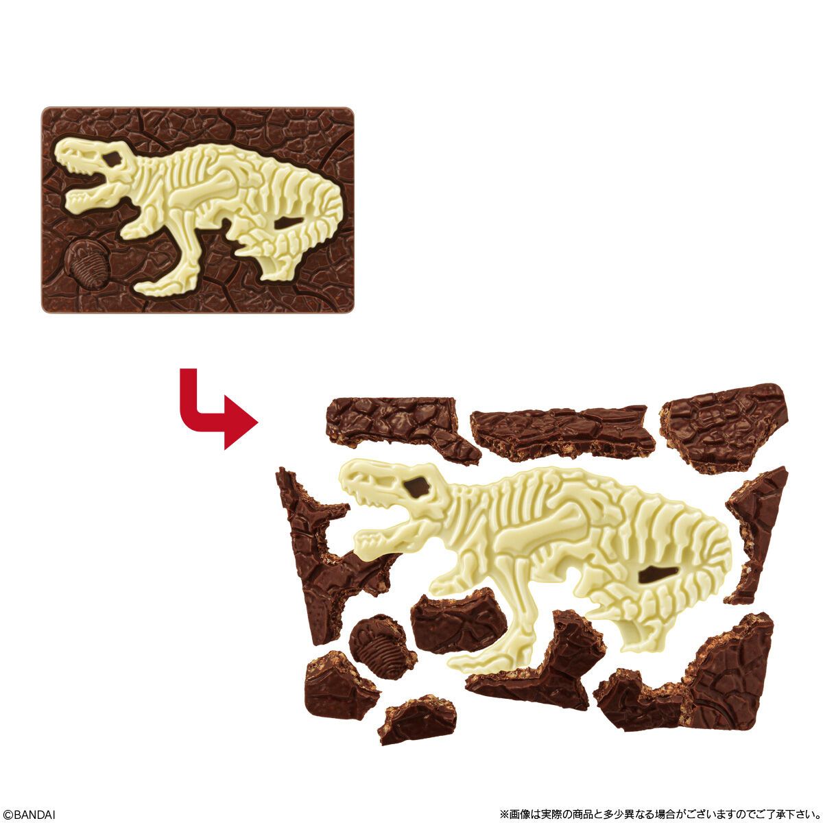 「キャラパキ 発掘恐竜」では、パフ入りの板型のミルクチョコから恐竜の化石をモチーフとしたホワイトチョコの型抜き(発掘)を楽しめます。
