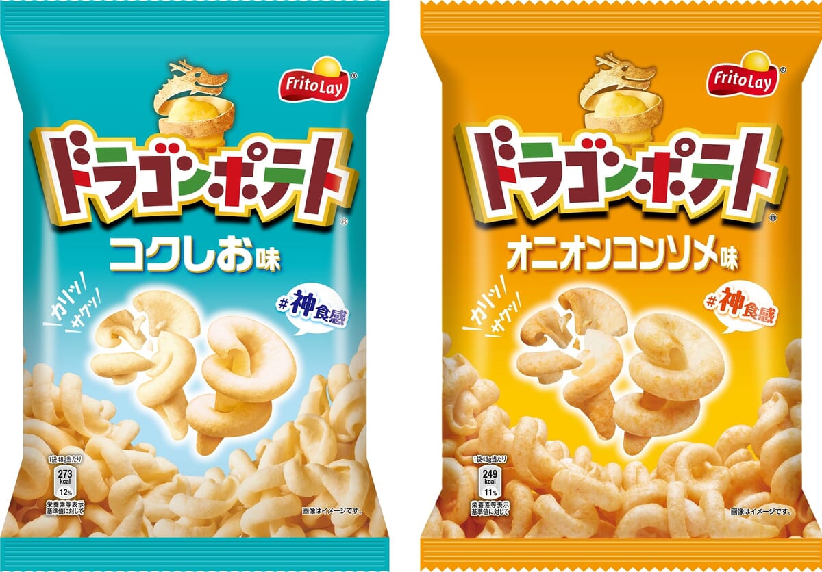 さらに、定番フレーバーの「ドラゴンポテト コクしお味」と「ドラゴンポテト オニオンコンソメ味」がコラボパッケージで販売されます。