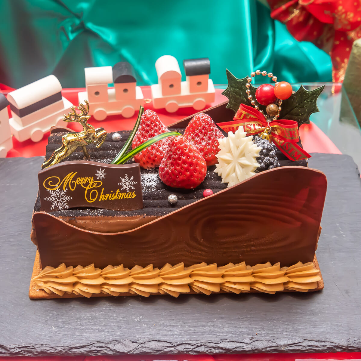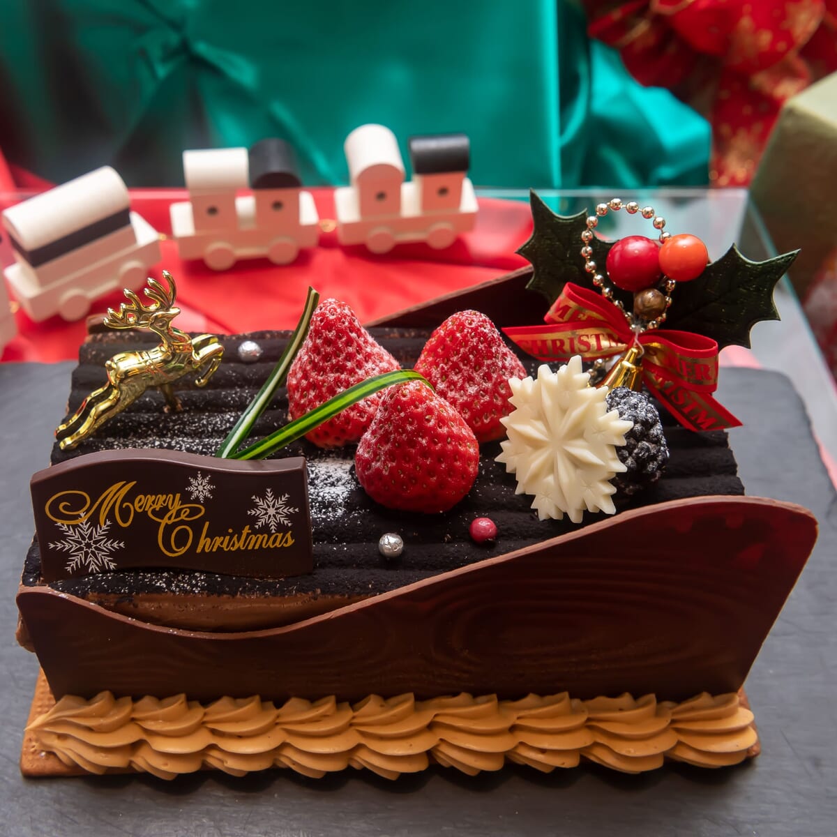 まるで今にもプレゼントを運んできそうな、チョコレートのソリをイメージした、クリスマスにぴったりのケーキ。