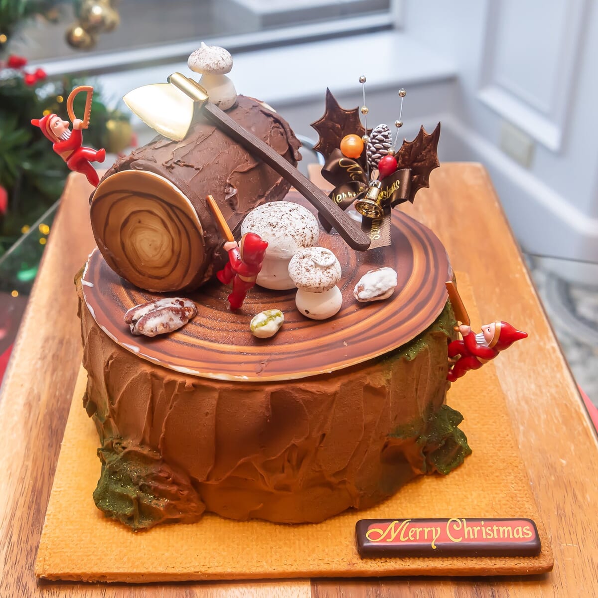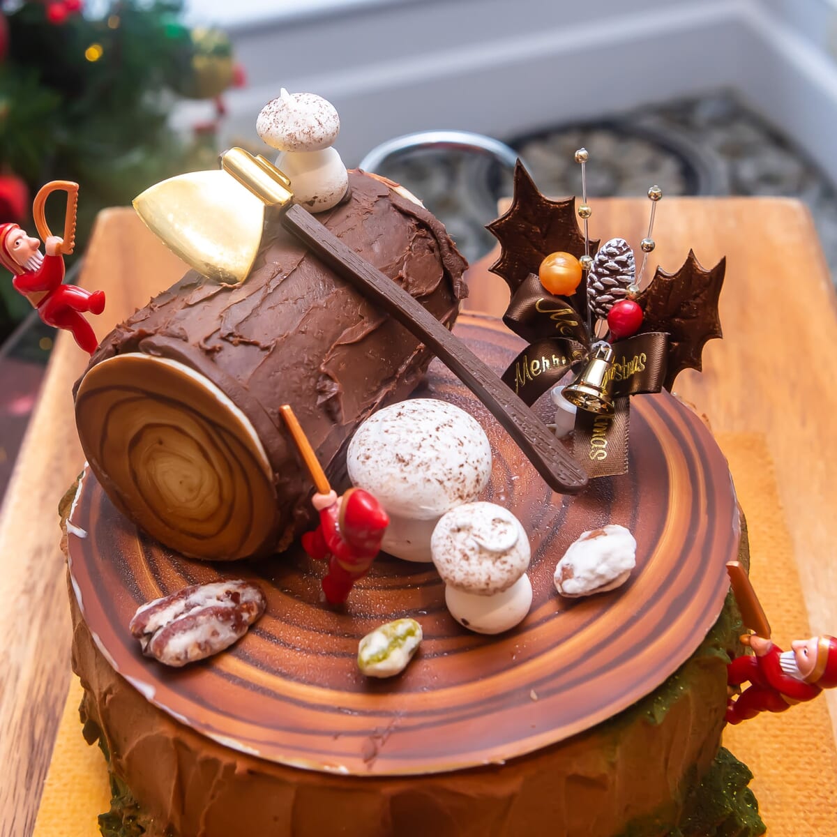 切り株の見た目や、抹茶パウダーで演出した苔、メレンゲのきのこ、丸太のチョコロールケーキ、木こりたちなどで飾りつけたフォトジェニックなケーキです☆