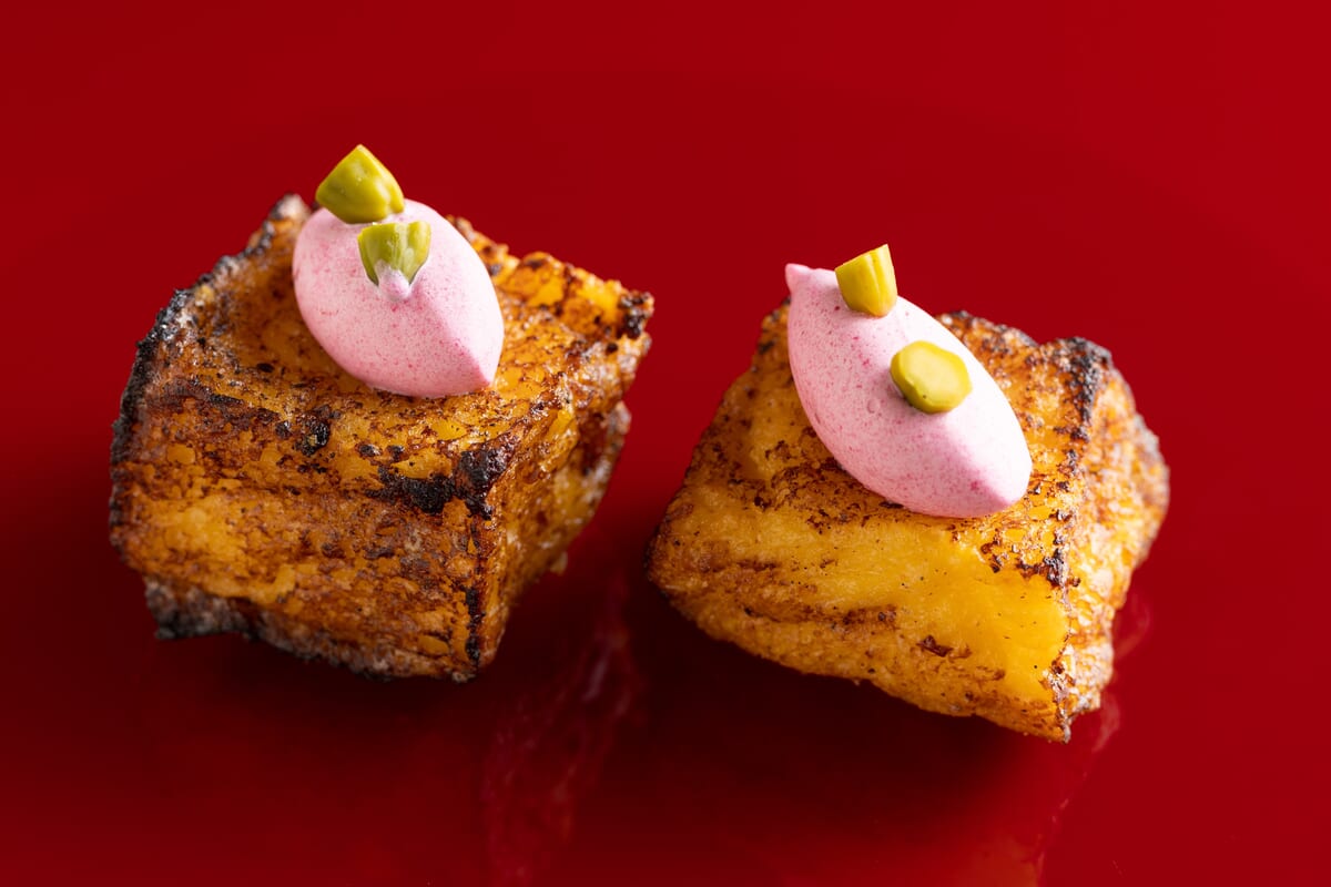 栗のハチミツとフォアグラのフラン ビーツのコンソメジュレ