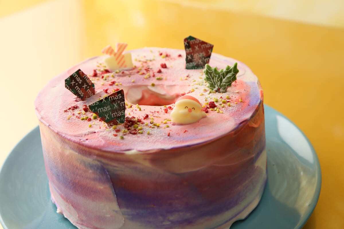 淡く優しげなパステルピンクやパープル、ホワイトのクリームを丁寧にナッペして、クリスマスらしい神秘的なカラーリングに仕上げられたスイーツです。