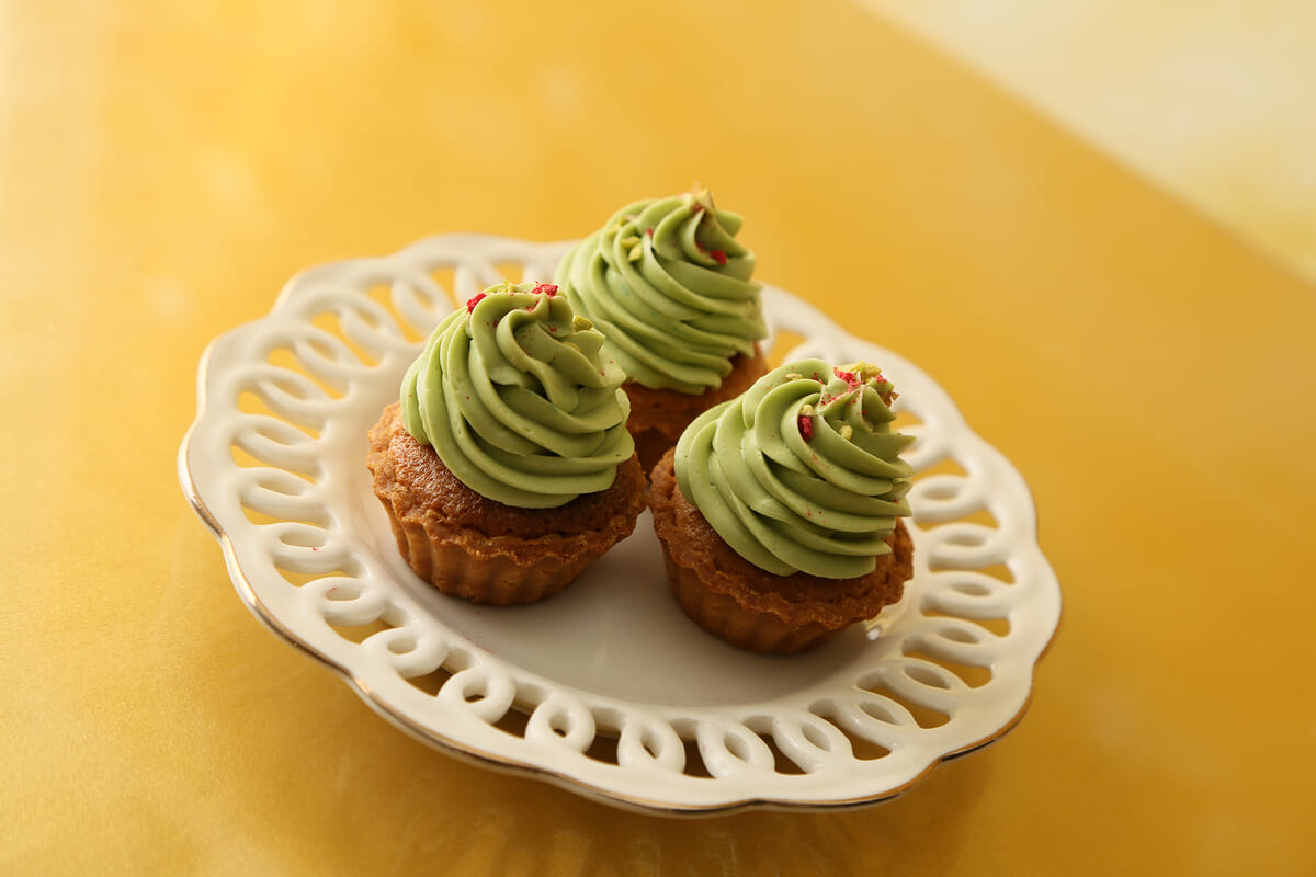 タルトカップにピスタチオクリームを絞り、クリスマスツリーに見立てた、ミニサイズのかわいらしいモンブラン。