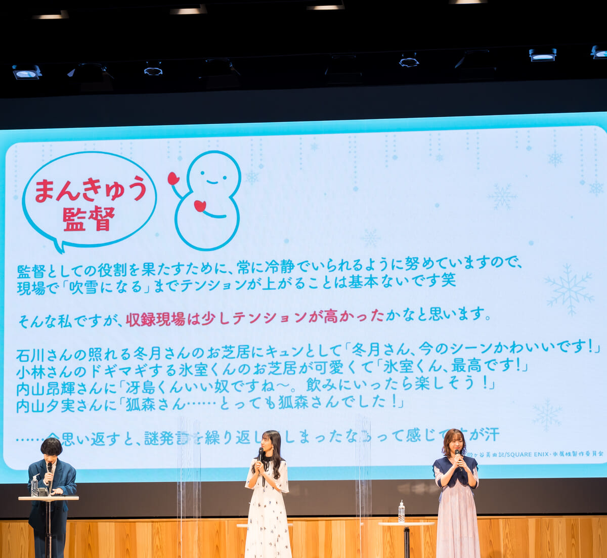 まんきゅう監督のテンションが上がった話では、キャラクターを正確に表現する演者たちに感動したエピソードを披露。
