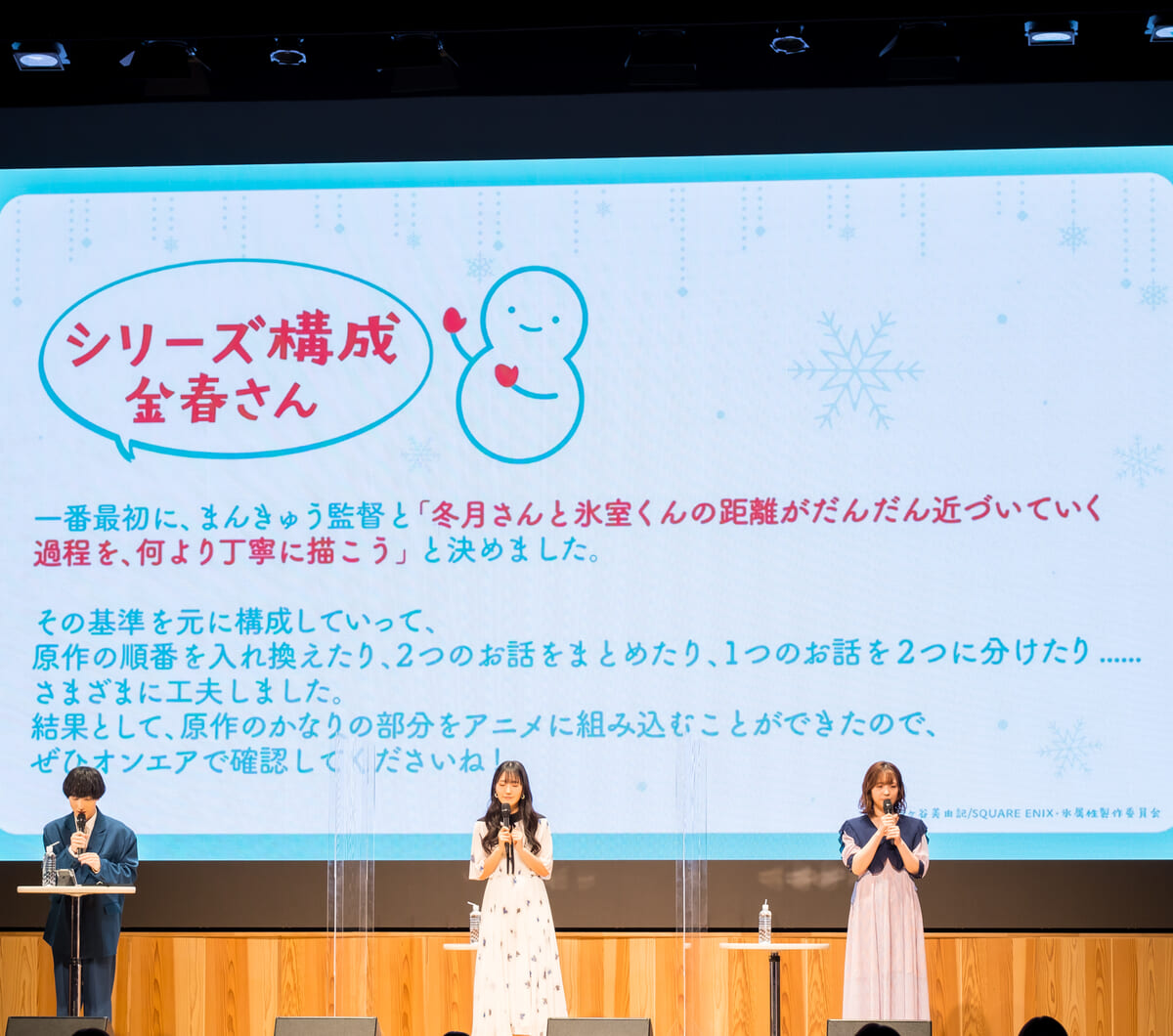 シナリオ構成に関するこだわりポイントでは、「冬月さん」と「氷室くん」の距離感がだんだん近づく過程を丁寧に描いていると、シリーズ構成のスタッフからコメントも。