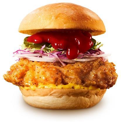 「ティラノチキン」にカリフォルニアのシラチャーソースや、ロッテリアオリジナルハニーマスタードソースを合わせ、刺激的な辛味が癖になる旨辛チキンバーガー。