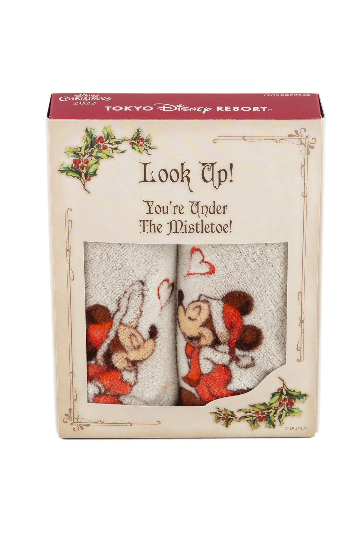 ヤドリギの下でキスをするかわいい「ミッキーマウス」と「ミニーマウス」がデザインされたグッズ。