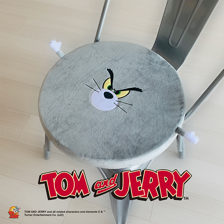 丸いクッションの真ん中に「トム」のお顔があしらわれた、ユニークなデザインの座椅子クッション。