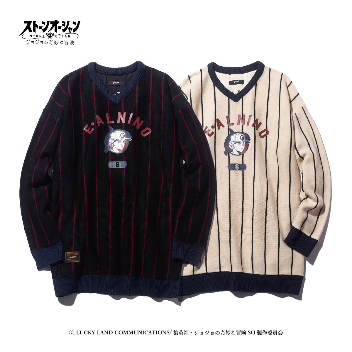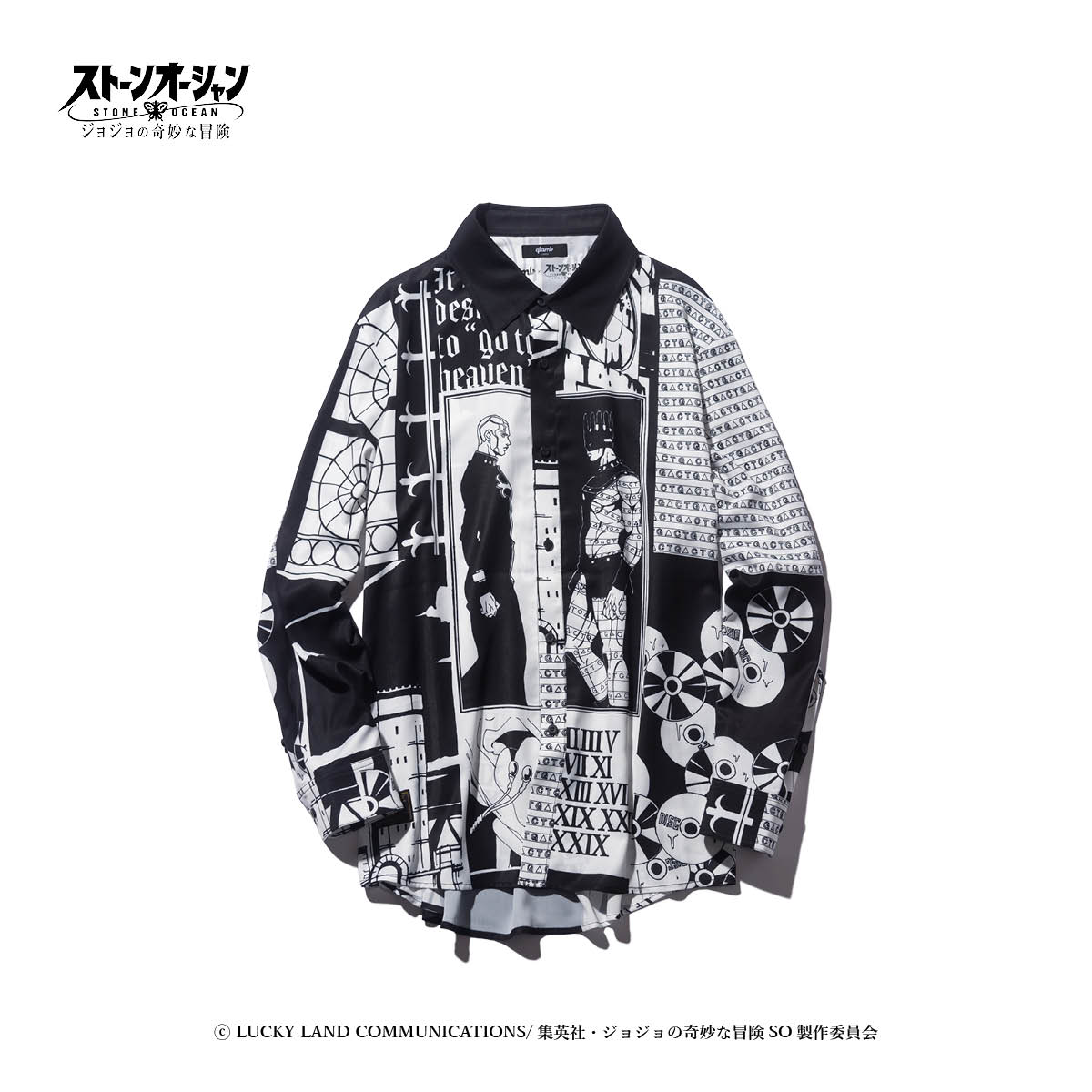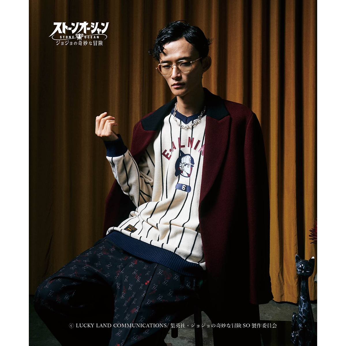 glambの得意とするバンドT的なデザインのアイテムに加え、スカジャンに総柄シャツ、ニットなど『ジョジョの奇妙な冒険 ストーンオーシャン』の世界観を閉じ込めた様々なトップスが展開されます。