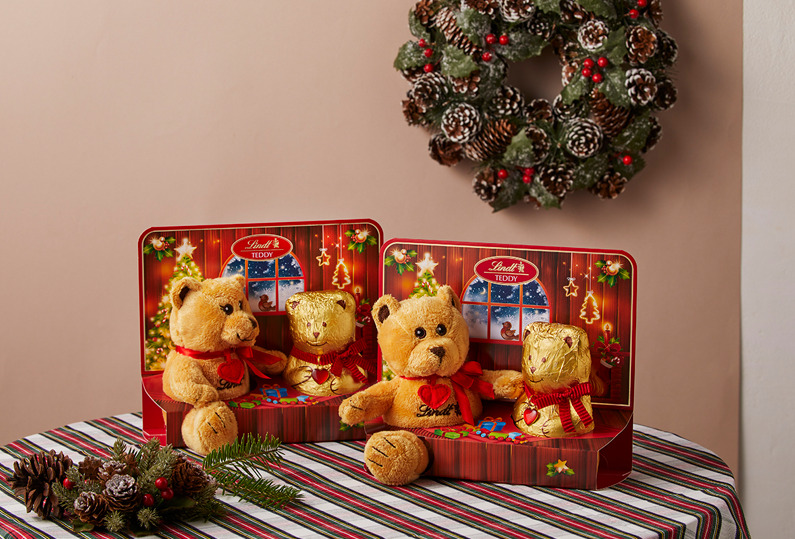 「リンツ」のチョコレート職人が、幼い頃の幸せな記憶の象徴であるテディベアをかたどった、ゴールドに輝くボディにハートのチャームを身に着けたチョコレート「リンツテディ」と、そのテディのぬいぐるみがセットになったギフト。