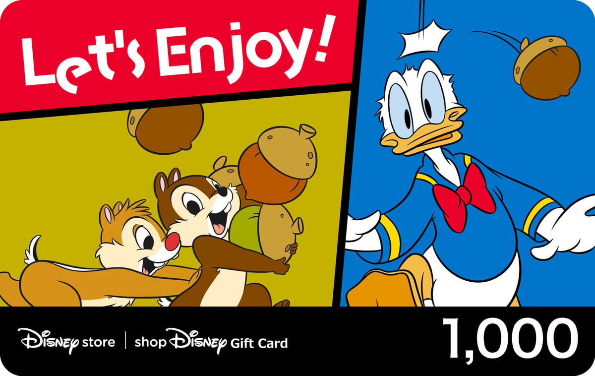 プラスチック型のギフトカードは、小さな手で目を隠す「チップ」と「デール」が描かれた1,000円カードのほか