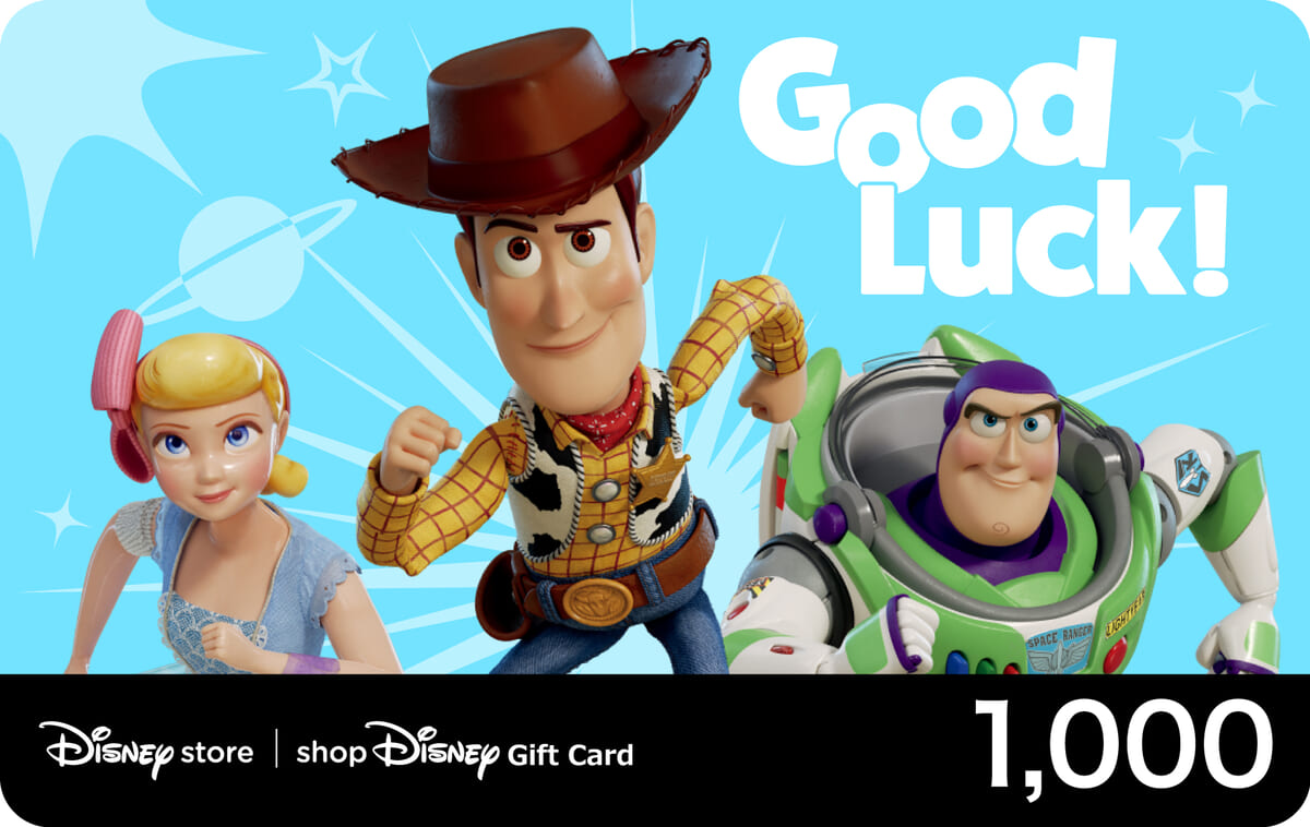 「Good Luck!」の文字と共にディズニー&ピクサーアニメーション「トイ・ストーリー」シリーズの「ウッディ」「バズ・ライトイヤー」「ボー・ピープ」が描かれたカードや