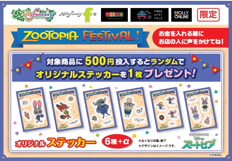 期間中、「モーリーファンタジー」「PALO」「PRISE SPOT PALO」、オンラインクレーンゲーム「モーリーオンライン」にてディズニー映画『ズートピア』の限定プライズゲーム用景品が登場。