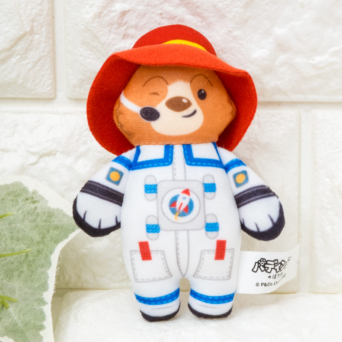 トレードマークの赤い帽子に、宇宙飛行士の衣装を着た「パディントン」