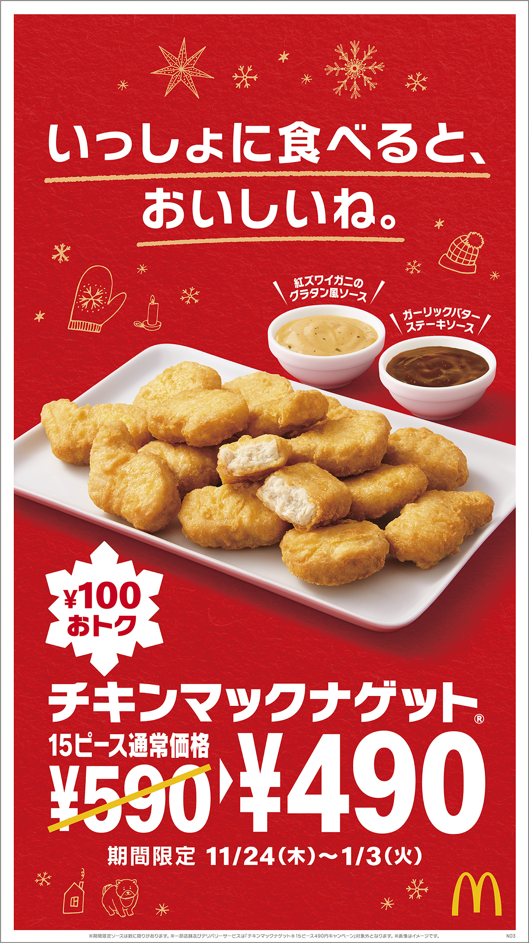 みんなでシェアしておいしい「チキンマックナゲット15ピース」と、冬にピッタリな2種のソースが期間限定で登場!