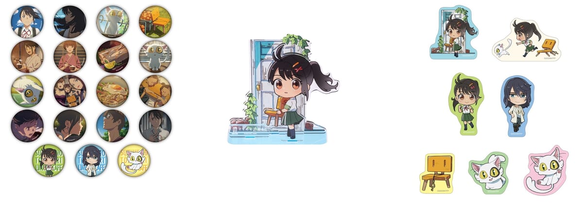 「岩戸鈴芽」のアクリルスタンドや、様々なキャラクターを描いた缶バッジ、ステッカー。