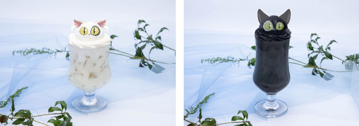 小さな白猫「ダイジン」をイメージしたアプリコットミルクフロートと、大きな黒猫「サダイジン」をイメージしたほうじ茶ミルクフロート。