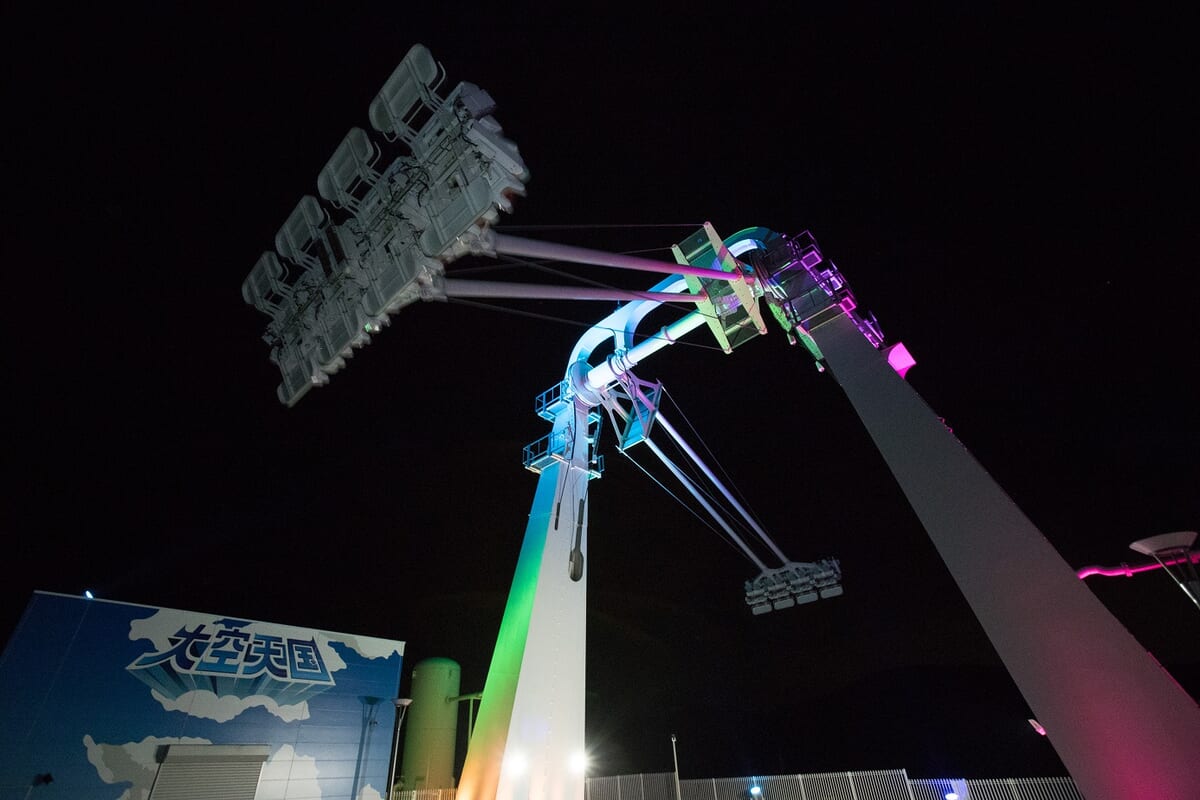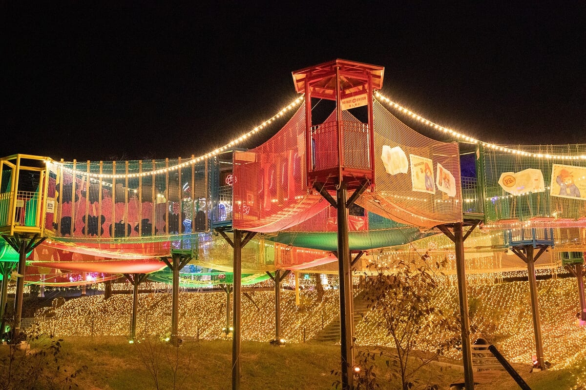 20種類のアクティビティを楽しめる、空中ネットアスレチック「ハッスルスパイダー」がカラフルにライトアップ。