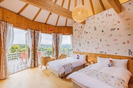 兵庫県立淡路島公園内に佇むラグジュアリーヴィラ「グランシャリオ北斗七星135°」の、「ハローキティ」の世界観をテーマにしたコラボルーム「ハローキティ 星のコクーン」「ハローキティ ナチュラルフォレスト」「ハローキティ 70’s」