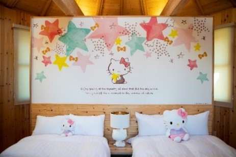 コラボルーム「ハローキティ 星のコクーン」「ハローキティ ナチュラルフォレスト」「ハローキティ 70’s」は、3つのテーマに分かれた「ハローキティ」のデザインが部屋中に施されている3棟限定のヴィラです。