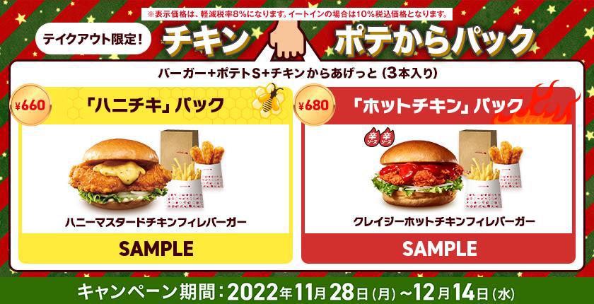 内容:ハニーマスタードチキンフィレバーガー、フレンチフライポテト S、チキンからあげっと(3本入り)