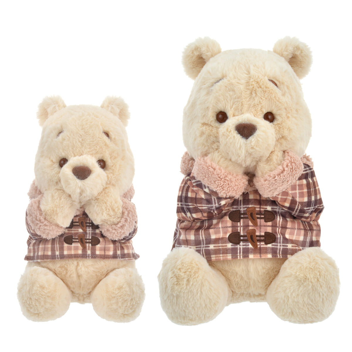 コレクションには、暖かそうなチェック柄のダッフルコートを身に着けた「プーさん」が両手に息を吹きかけて温まっているポーズがキュートなぬいぐるみやぬいぐるみキーチェーンがラインナップ。