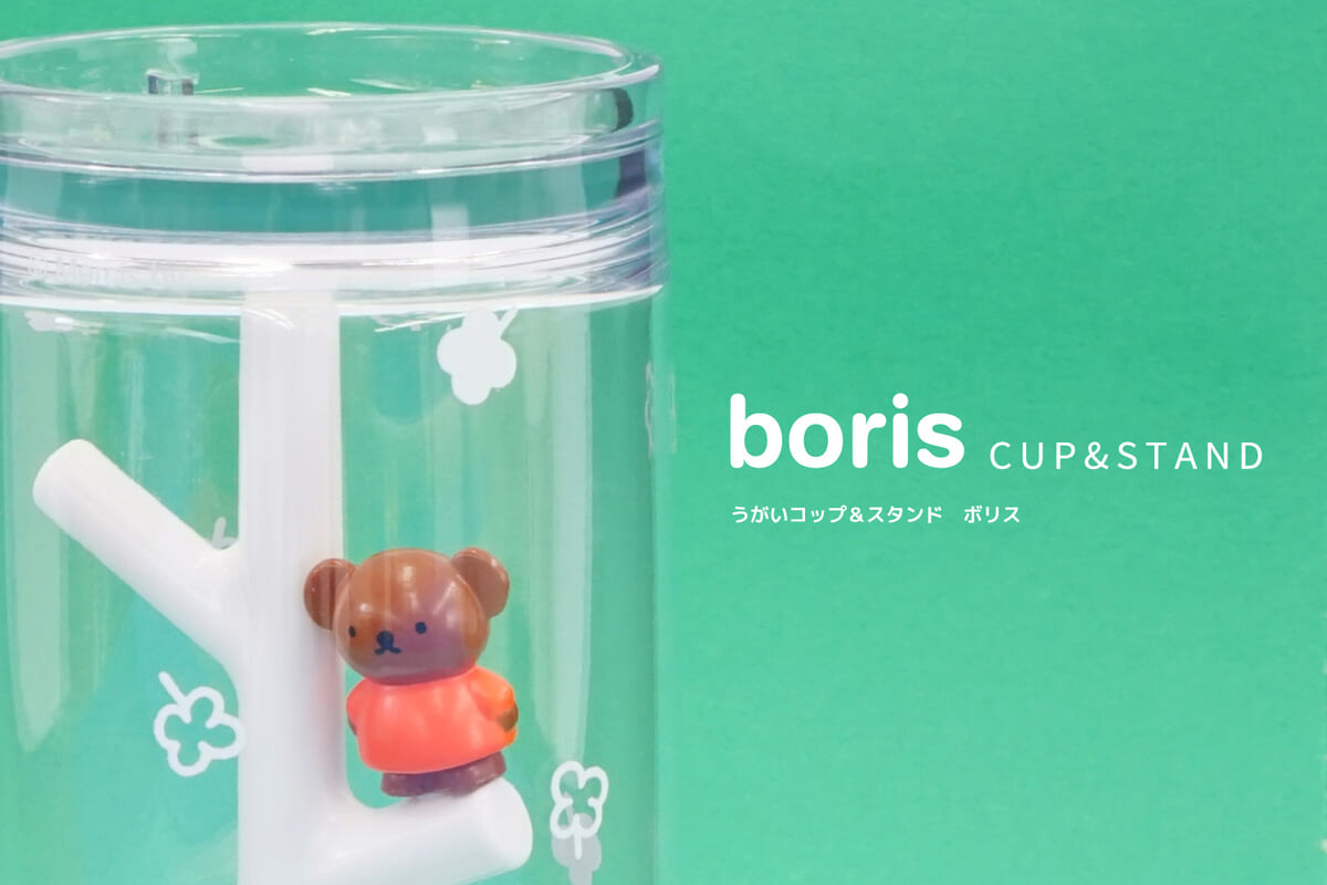 「ボリス」のフィギュア付きのスタンドに、モチーフデザインのコップが付属。