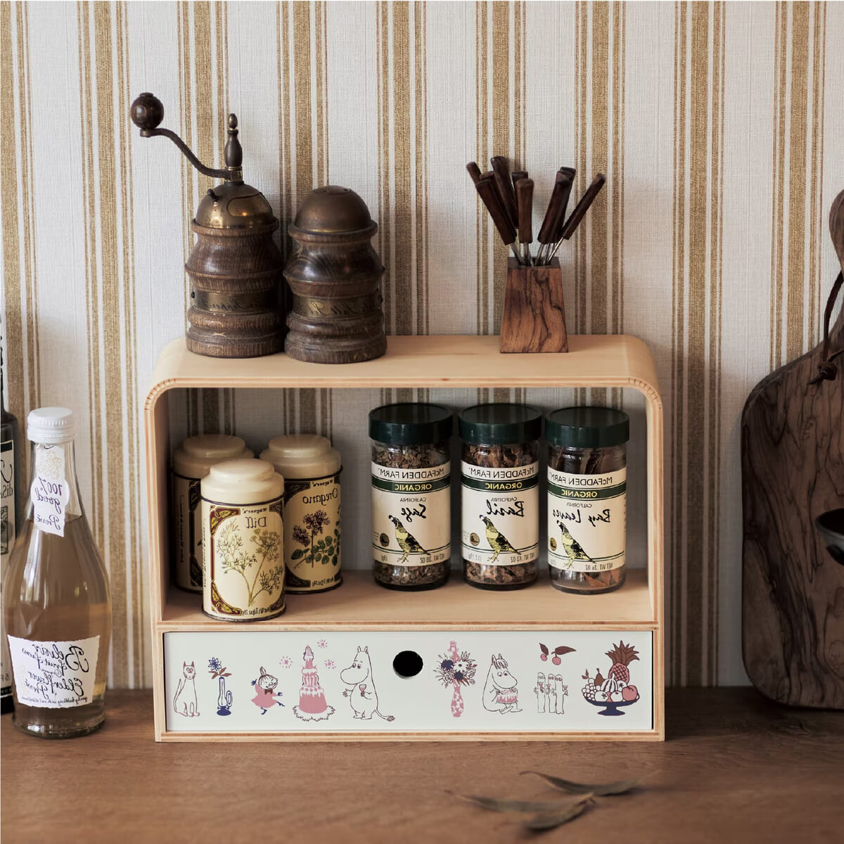 引き出し両面に描かれた「ムーミン」たちが愛らしい、おしゃれなスパイスラック!
