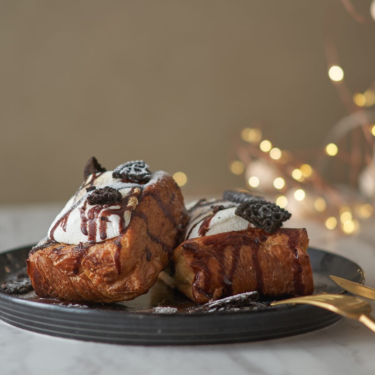 カカオニブやココアビスケットをトッピングした、冬限定のフレンチトースト。