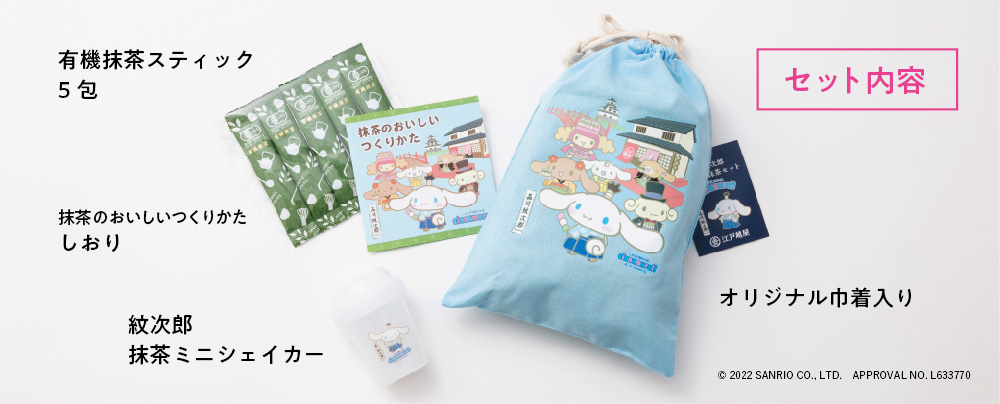 セット内容:品川紋次郎 イラスト入りオリジナル巾着、品川紋次郎 抹茶ミニシェイカー、有機抹茶スティック 5包、つかいかたのしおり