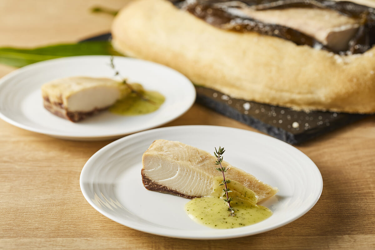 ・鰤の塩釜焼き 柚子と青のりのブールブランソース