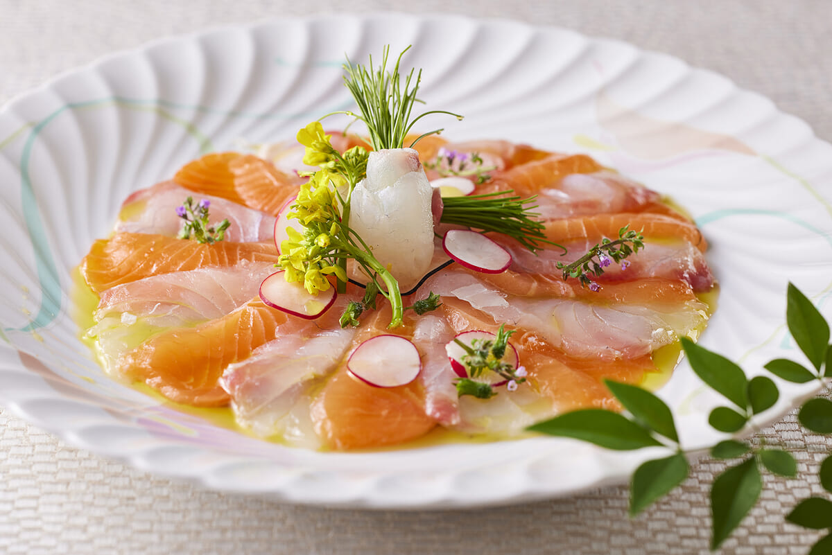 彩りも美しい「昆布締め真鯛とサーモンの紅白カルパッチョ仕立て」などの洋食も登場。