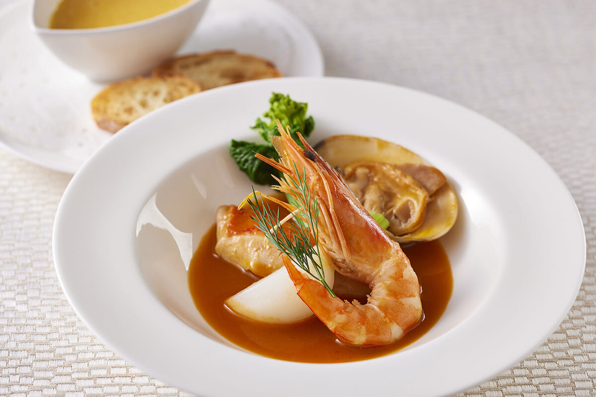 ル・ジャルダン自慢のハースグリラーで焼き上げる「海老と帆立貝のグリル ショロンソース添え」、凝縮した魚介のスープで体も心も温まる「金目鯛と蛤のブイヤベース」がラインナップ。