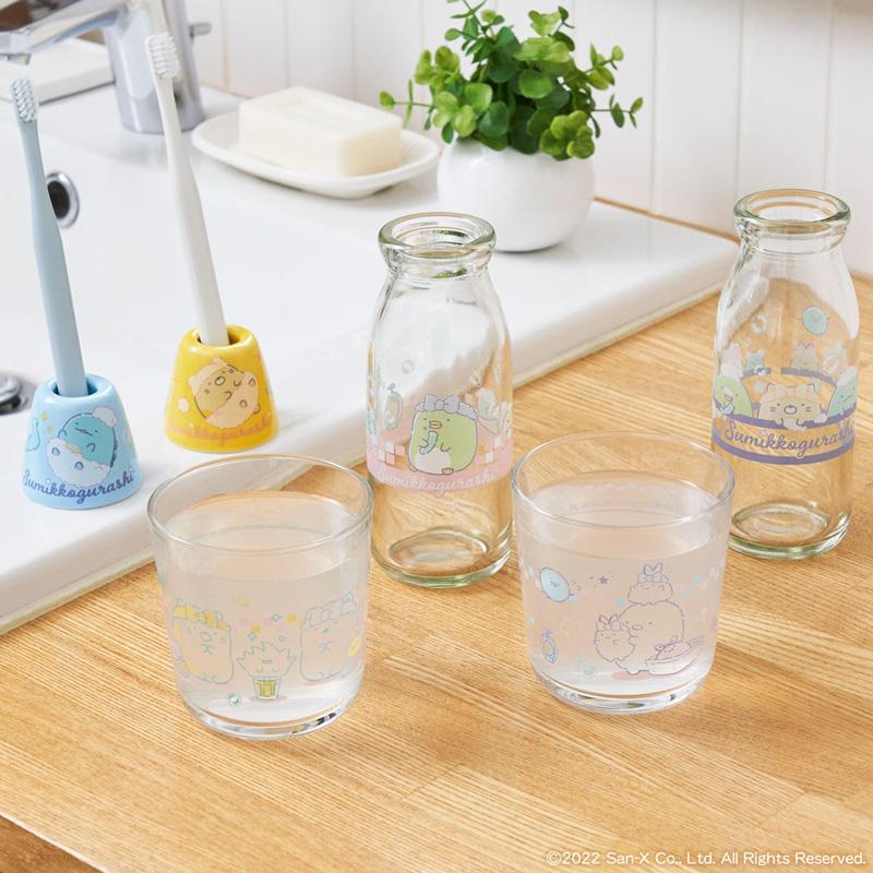 バスタイムを楽しむ「すみっコ」たちのイラストが描かれた、グラスと牛乳瓶と歯ブラシスタンドのアソートです。