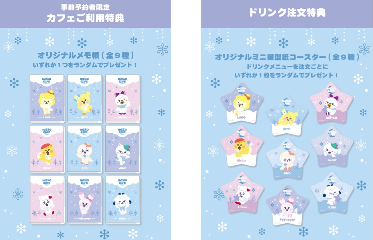 事前予約者限定カフェ利用特典として、事前予約(税込715円/1名)を利用しメニューを注文した方に「オリジナルメモ帳(全9種)」をランダムで1つプレゼント。