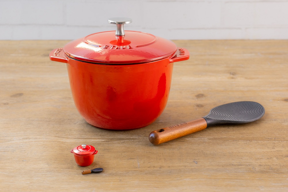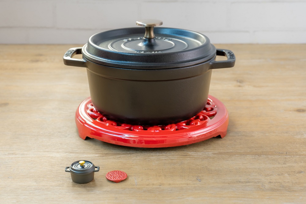 鍋には鍋敷きの「リリートリベット」や、ストウブ初の日本製ご飯茶碗「Le Chawan」、オーブンやレンジ、冷凍・冷蔵に使える「レクタンギュラーディッシュ」などのミニチュアをセット。