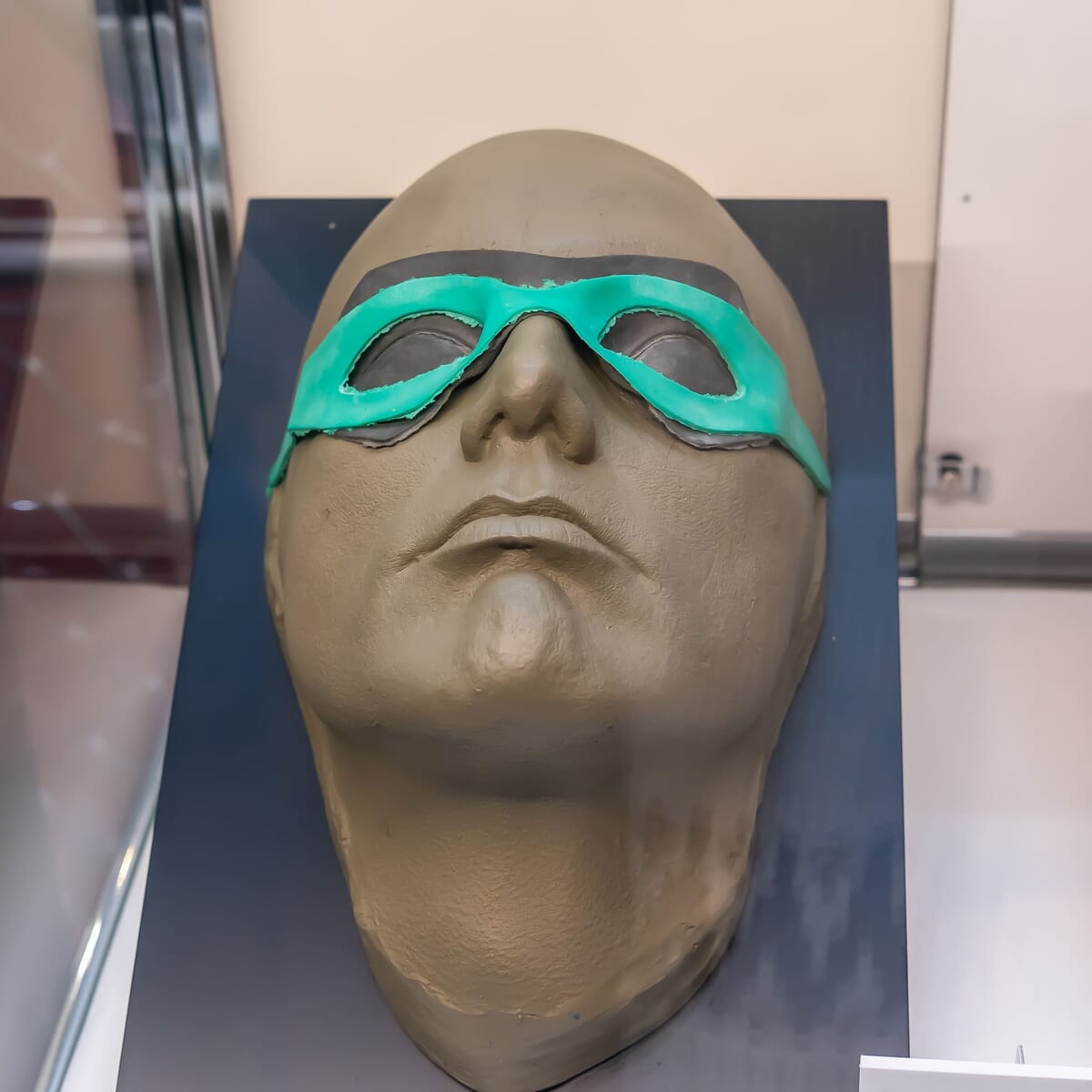 『バットマン フォーエヴァー』でリドラーを演じたジム・キャリーさんのライフマスクとリドラーのアイマスク。