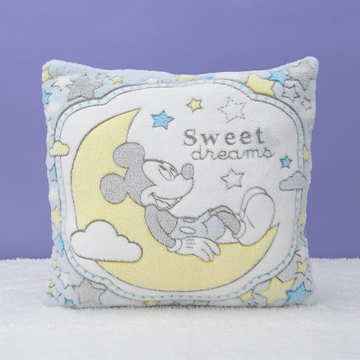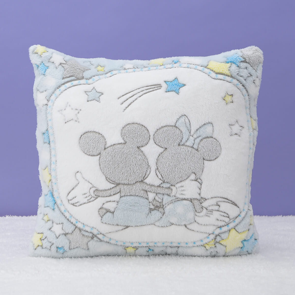 「ミッキーマウス」と「ミニーマウス」をデザインした、ふわふわ素材のクッション。