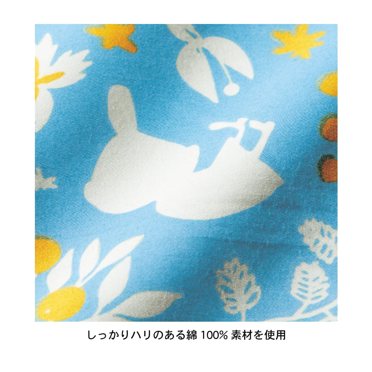 爽やかなブルーに、お花や「ムーミン」たちのシルエットがデザインされた、華やかなデザインのシーツです。