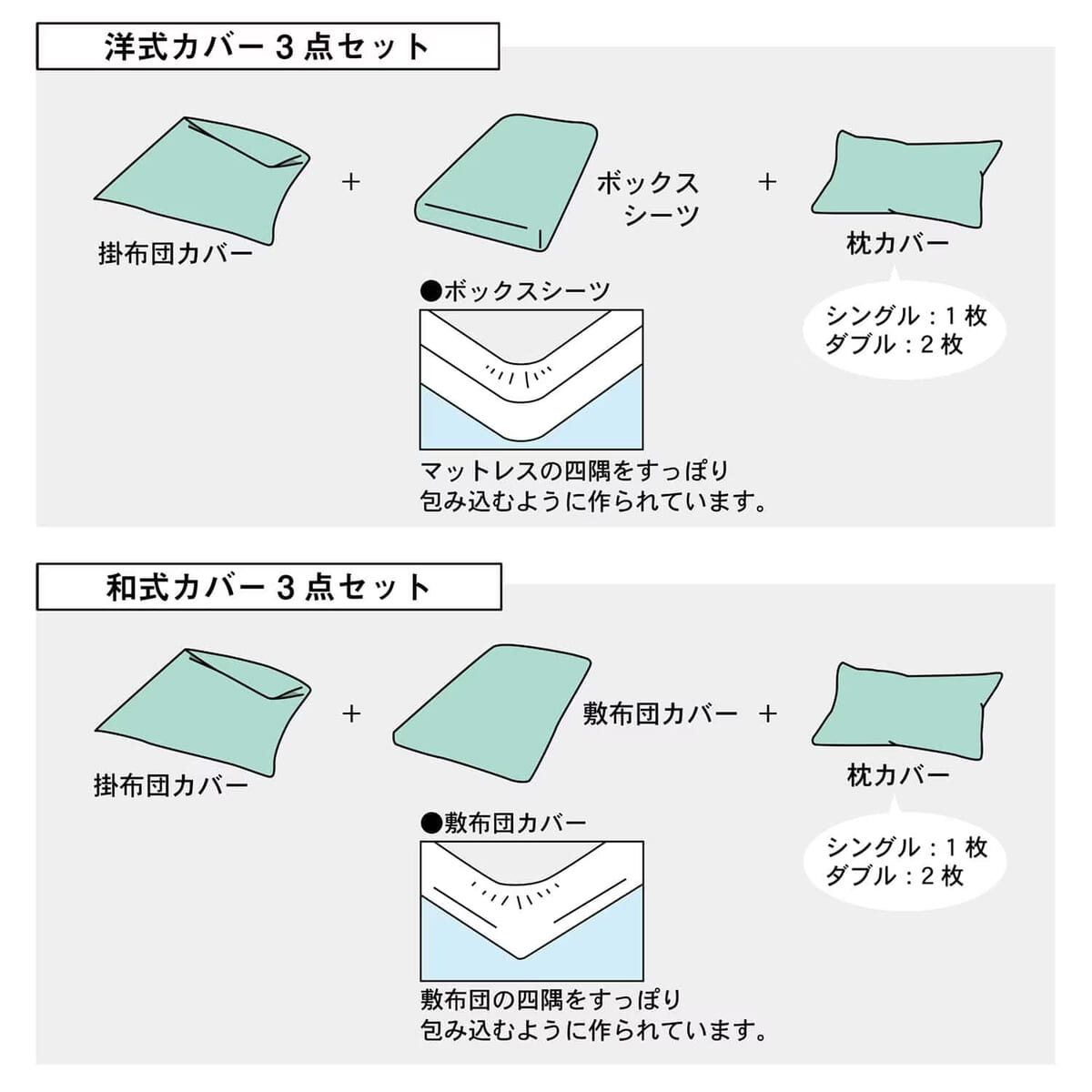 カバーリング3点が一度にそろうセットで、ベッド用の「洋式カバーセット」と敷布団カバーが入った「和式カバーセット」がラインナップされています。