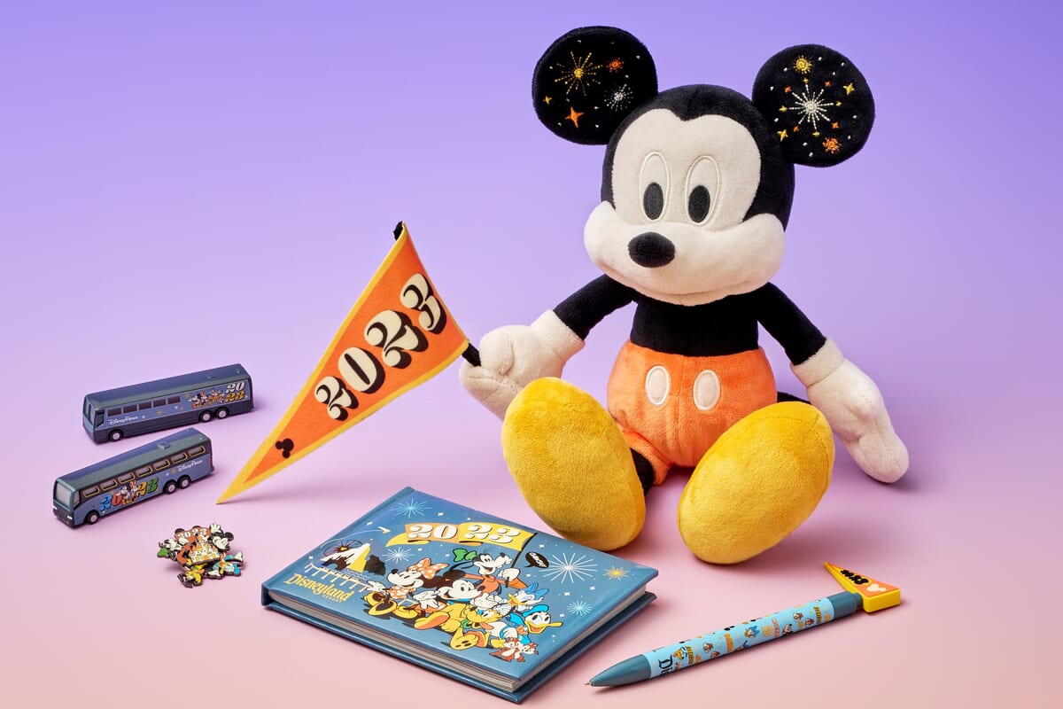「2023」のロゴ入りペナントを持ち、耳にはカラフルな花火の刺しゅうが入った「ミッキーマウス」のぬいぐるみや、ウォルト・ディズニー・ワールド・リゾートで運行しているバスをイメージしたダイキャストバスを展開。