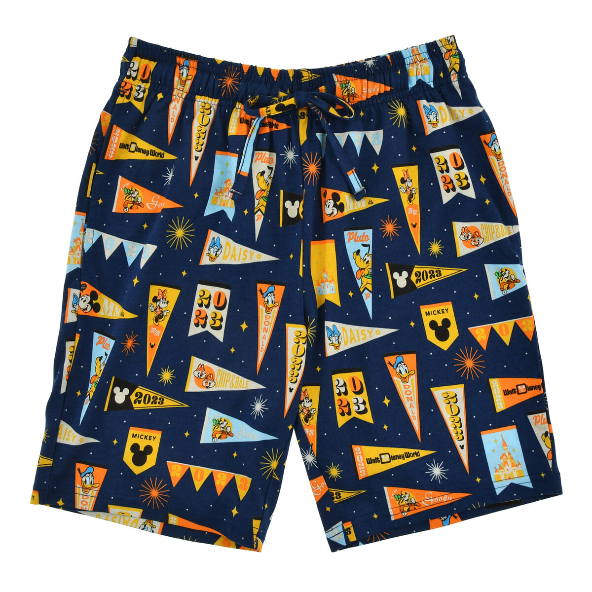 ペナントやフラッグ風のロゴが並んだ、カラフルでにぎやかなショートパンツ。