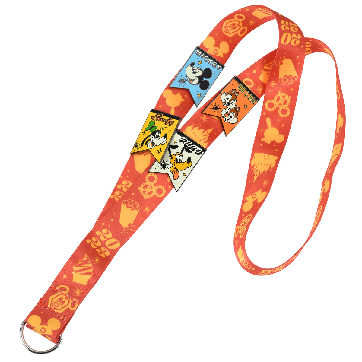 ミッキー&フレンズとイヤーロゴがデザインされた、ストラップ付きピンバッジセット。