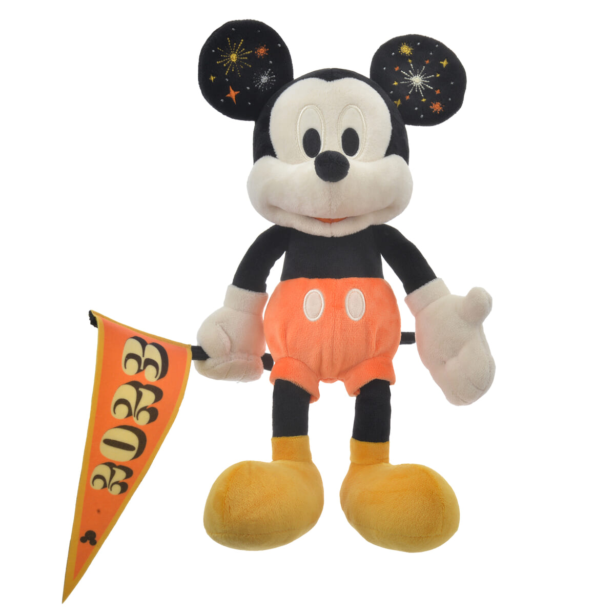 「2023」のロゴ入りペナントを持った「ミッキーマウス」のぬいぐるみ。