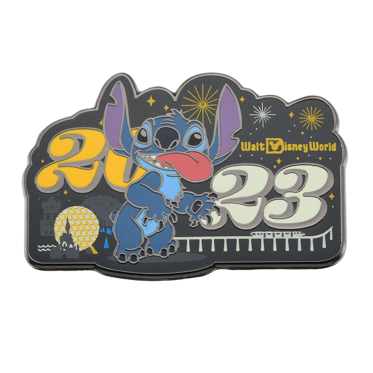 「スティッチ」の背景に「2023」のロゴをあしらったダイカットピンバッジ。