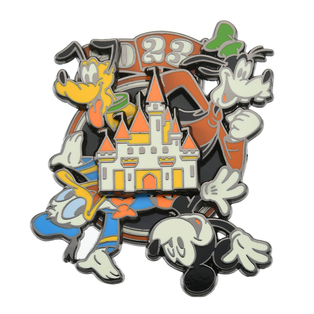 「2023」のイヤーロゴとお城のシルエットをあしらったカラフルなピンバッジです。