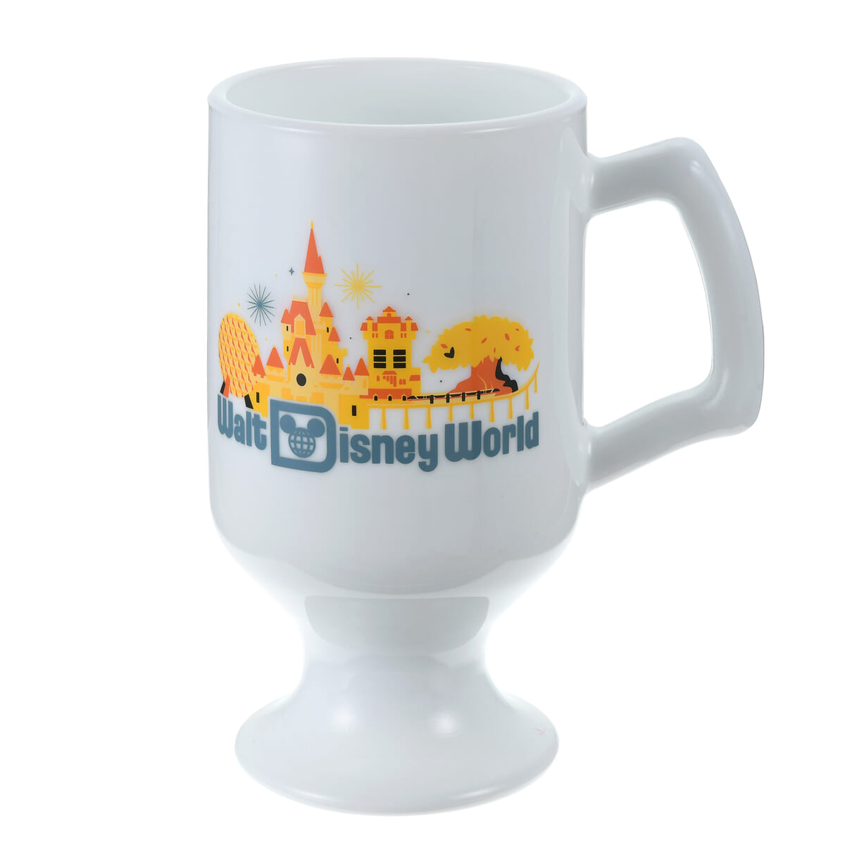 ミッキーアイコンをあしらった「Walt Disney World」のロゴと、にぎやかなテーマパークの風景がされた脚付きマグカップ。