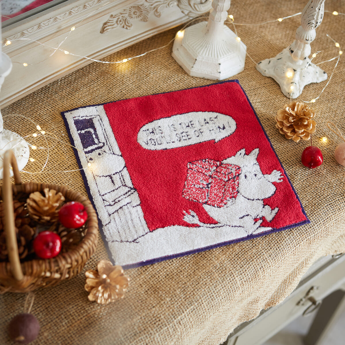 大きなプレゼントを抱えてなにやら忙しそうな「ムーミン」や、逆立ちをする「ムーミン」とそれを見つめる「リトルミイ」を描いたシーンの各3色ずつ計6種がラインナップ。