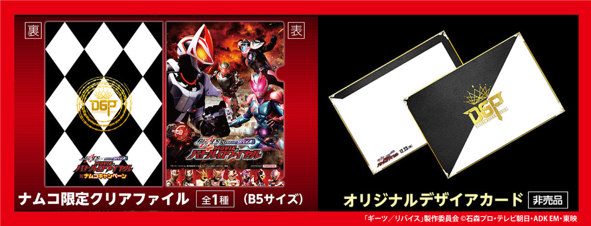 2022年12月23日より公開の映画『仮面ライダーギーツ×リバイス MOVIE バトルロワイヤル』の入場者プレゼント「一気にブースト!バトロワダッシュヒーロー」をナムコの対象店舗へ持っていきスタッフに見せると、「ナムコ限定クリアファイル&オリジナルデザイアカード」がもらえます。
