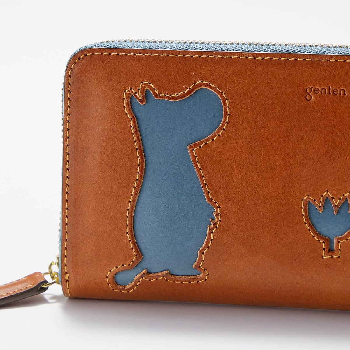 「ムーミン」のgenten イタリアンレザーカットワーク長財布は、ブラウンとブルーのレザーを2重に使ったデザイン。